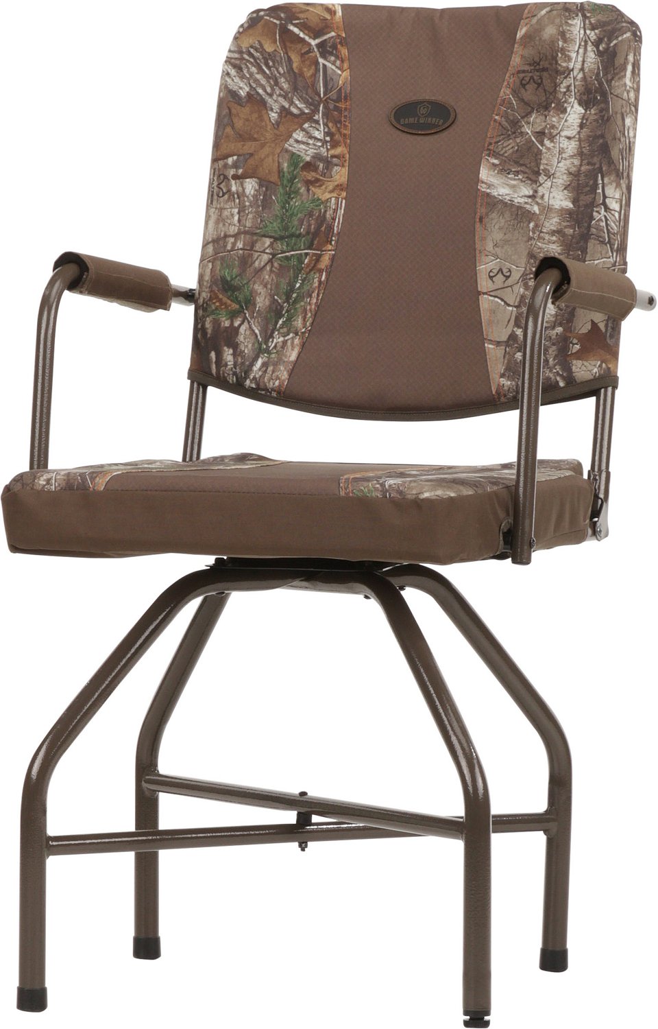 Great chair for ground blind i m big and 6 5 and works great it s very comfortable and swivel is quiet and nice wide seat.